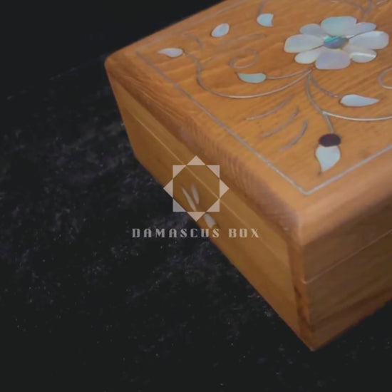 صندوق مشغل عربي، صندوق موزاييك دمشقي، صندوق مطعم بالصدف، حرفة دمشق، صندوق شرقي فاخر، هدية يدوية فاخرة، Damascus Box، فن دمشقي محفور