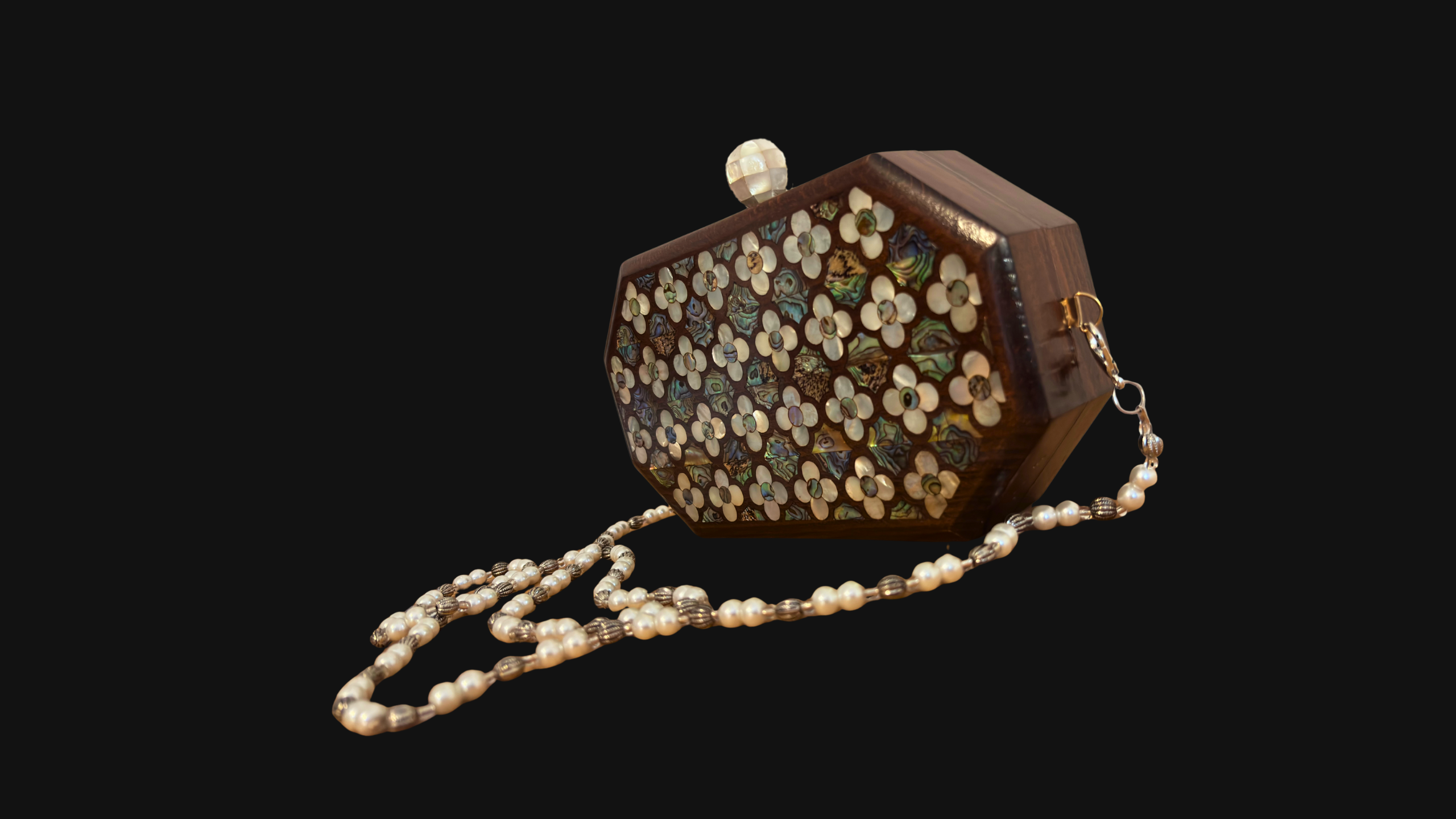 Jouri – Luxury Damascene Clutch with Mother of Pearl Rose Inlay & Pearl Rosary Chain