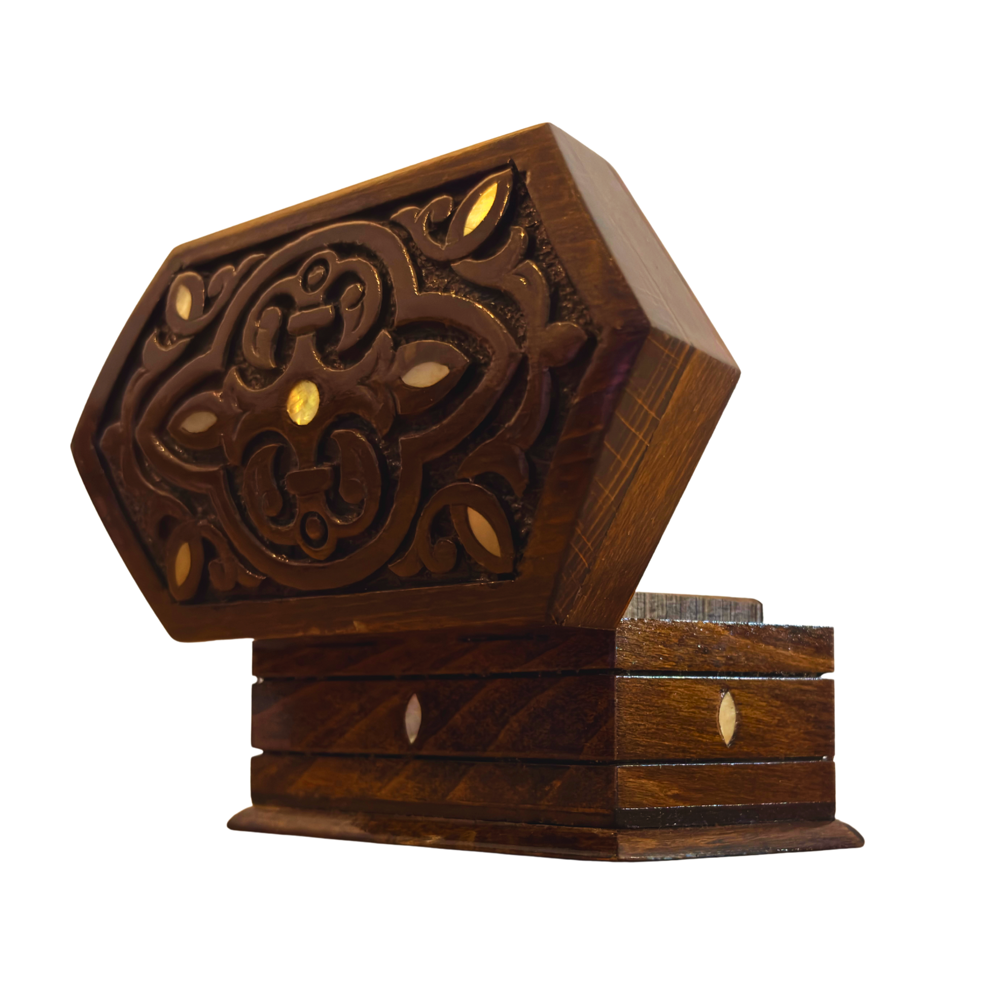 Each box is individually hand-carved, ensuring every piece is one of a kind — a true expression of Damascus artistry and devotion to craft.