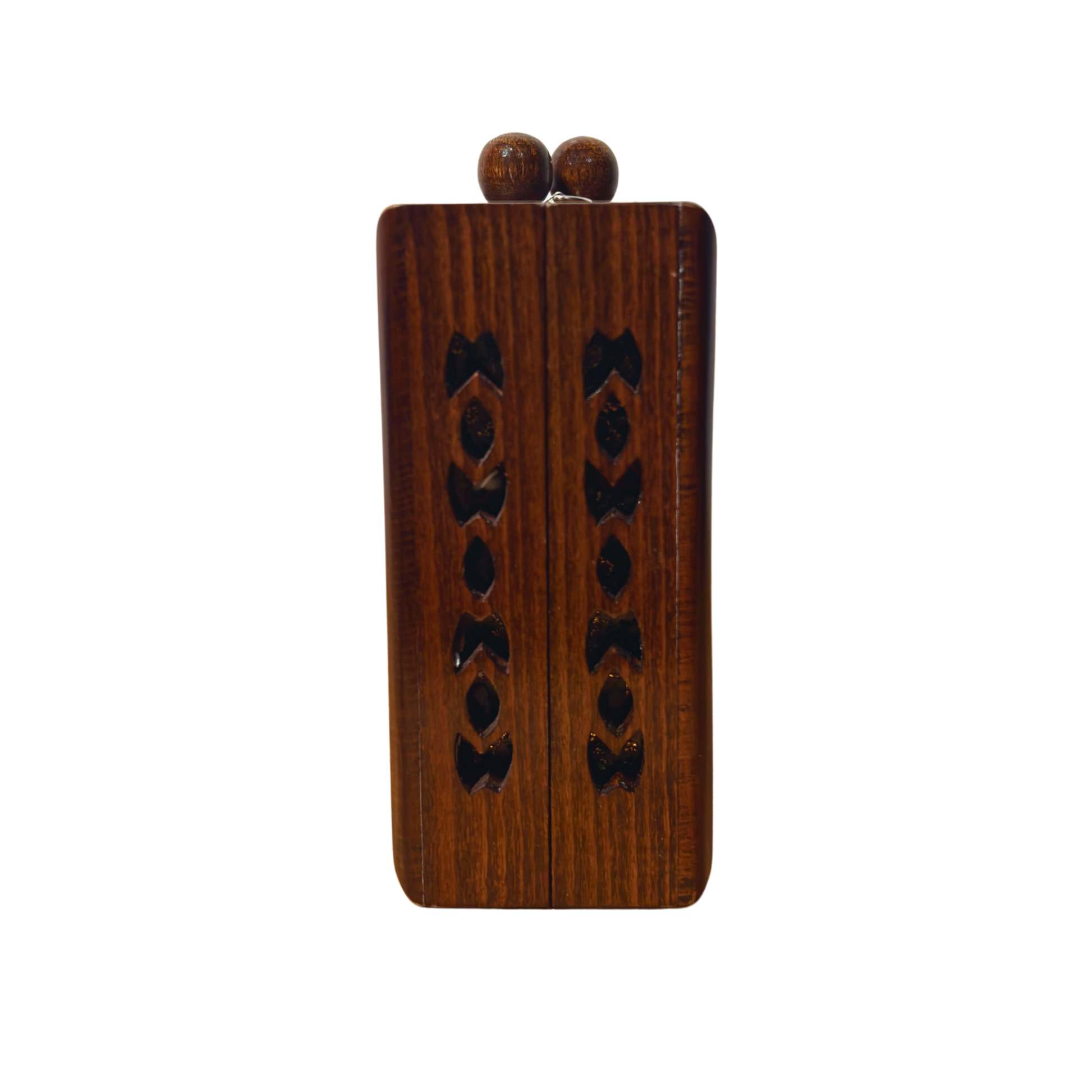 Tallado en madera de nogal y decorado con incrustaciones de nácar, este clutch refleja la elegancia refinada de la artesanía damascena. La cadena desmontable tipo rosario permite llevarlo al hombro o como bolso de mano.
