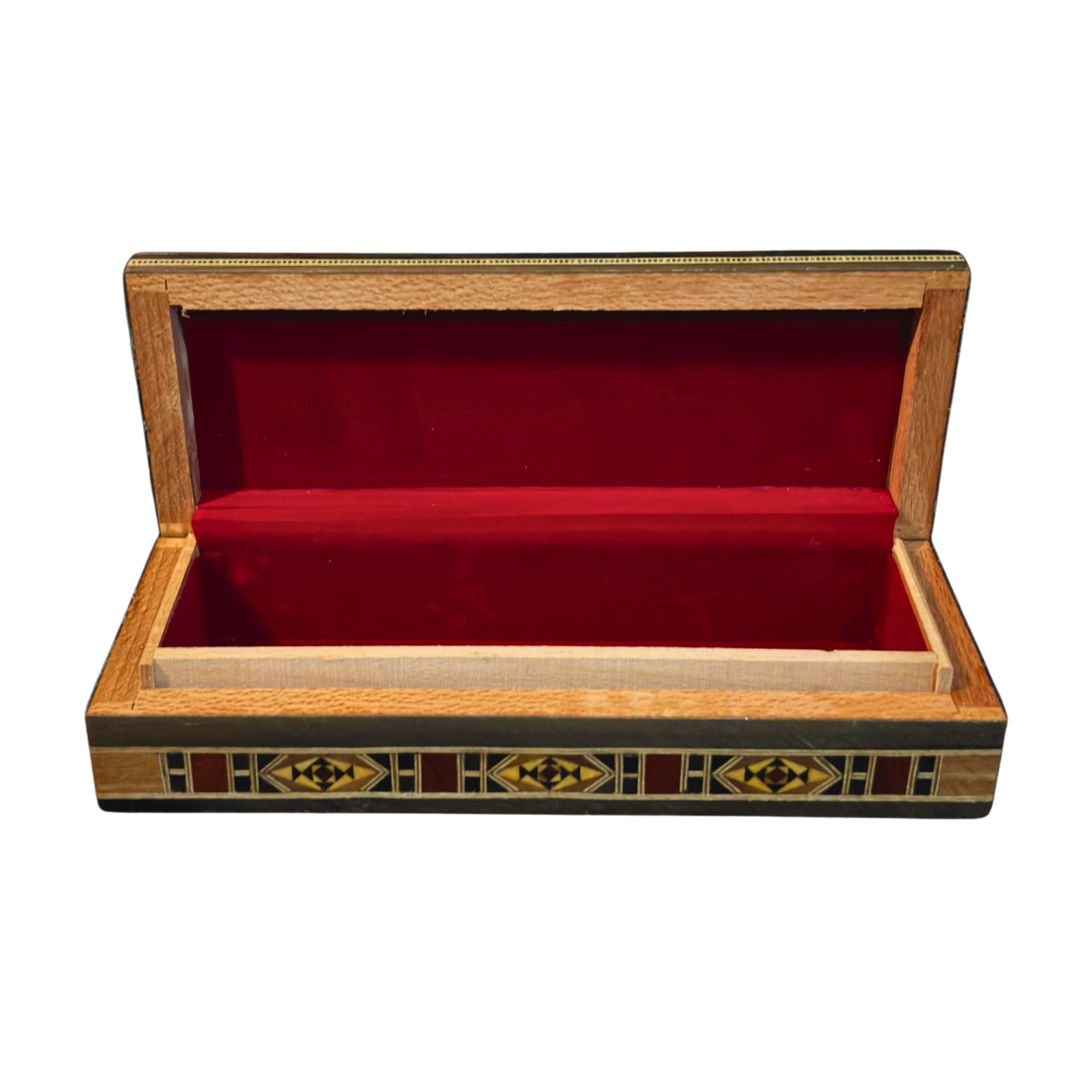 Decora tu espacio con esta impresionante caja de mosaico damasquino, cuidadosamente elaborada a mano en una forma rectangular y alargada que combina lo práctico con lo artístico. Fabricada con madera de nogal, haya, limón y pino amarillo, e incrustada con nácar auténtico, esta pieza presenta patrones geométricos inspirados en el arte tradicional sirio.