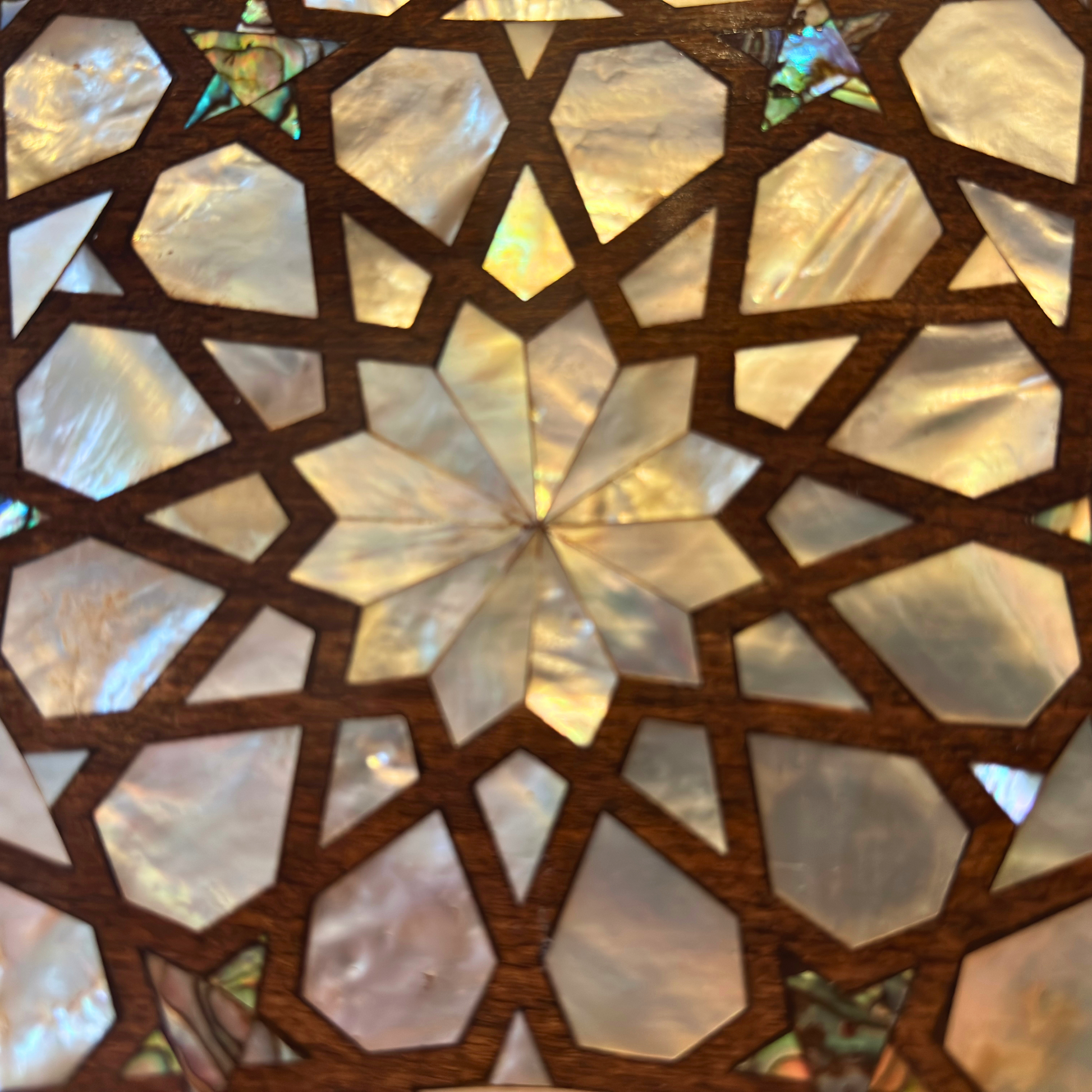 Tallado en madera de nogal premium y decorado con motivos estrellados de nácar auténtico, representa la armonía del arte tradicional sirio.
