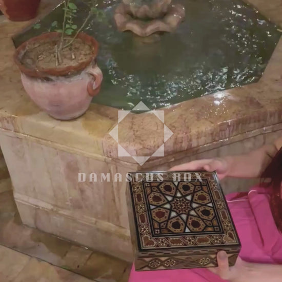 caixa de mosaico damasquina, Gaby Al Dayeh, madrepérola, arte síria, veludo, artesanato de luxo, Damascus Box
